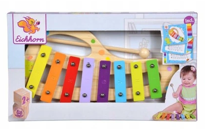 EH Drewniane cymbałki, 30 cm Drewniane cymbałki z 8 metalowymi, kolorowymi płytkami do wygrywania melodii, dołączony arkusz z nutami do piosenek. Wymiary: 30 x 15 cm, 2l+.