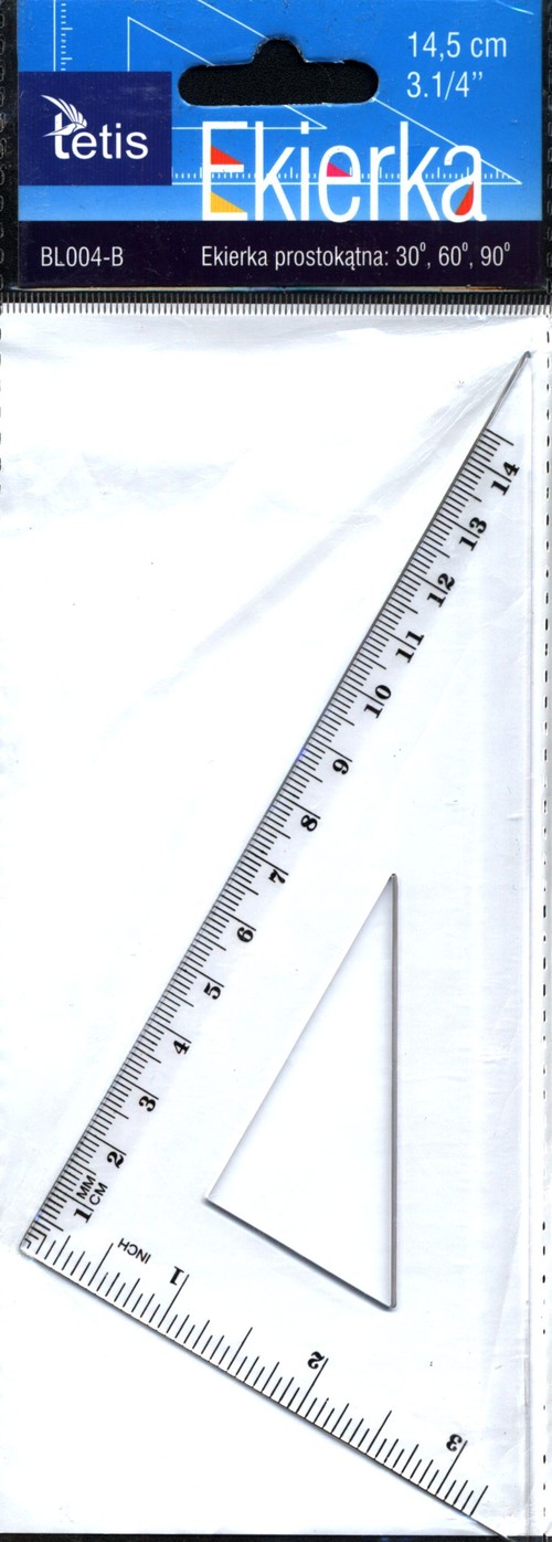 Ekierka prostokątna wykonana z przeźroczystego, trwałego tworzywa.