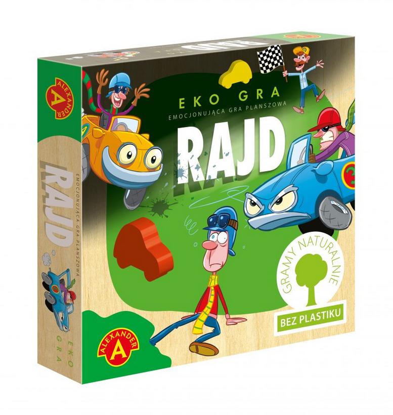 Eko Gra Rajd to emocjonująca gra typu wyścig w której gracze próbują jak najszybciej dotrzeć do mety. Liczba oczek wyrzuconych na kostce wskazuje o ile pól należy przesunąć pionki po torze. W trakcie rajdu po planszy każdego z graczy będą spotykały miłe lub przykre niespodzianki, kary i nagrody. Produkt nie zawiera plastiku. Wykonane z drewna kolorowe pionki w kształcie autek oraz kostka. Elementy drewniane barwione bezpiecznymi farbami wodnymi. Niefoliowana plansza oraz pudełko. Papierowa wypraska. Papier oraz drewno użyte w produkcji gry pochodzą ze sprawdzonych źródeł, które prowadzą zrównoważaną gospodarkę leśną, nie przyczyniając się tym samy do spadku ilości drzew w środowisku.