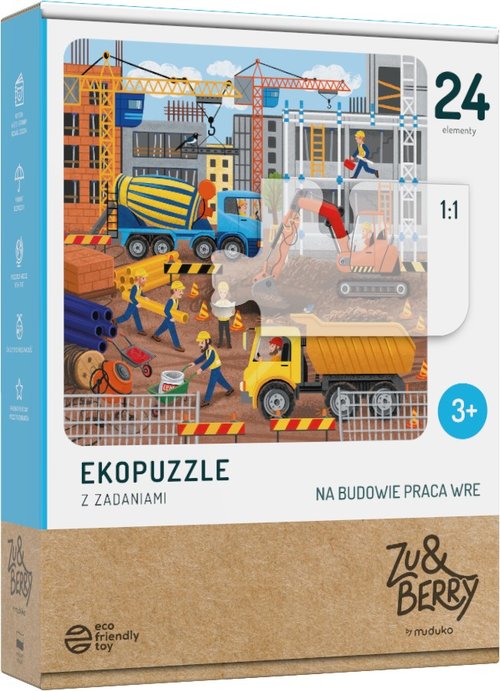 24-elementowy zestaw puzzli ukazuje pracowity dzień na placu budowy. Układanie puzzli jest dobrym narzędziem wspomagającym motorykę małą u dzieci. Daje też okazję do rozmowy o tym, jakie sprzęty są niezbędne podczas pracy oraz ile wysiłku potrzeba, żeby powstał nowy budynek. Do zestawu dołączone są zadania, które pozwalają ćwiczyć umiejętności liczenia i właściwego nazywania przedmiotów. Pomocnikami w zabawie są surykatka Zu i alpaka Berry (tekturowe figurki do samodzielnego złożenia).