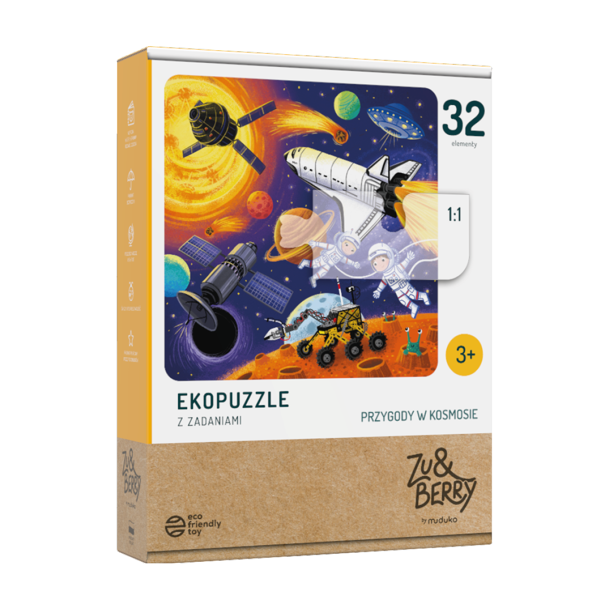 32-elementowy zestaw puzzli ukazujący dwoje dzielnych, młodych astronautów w kosmosie. Układanie puzzli jest dobrym narzędziem wspomagającym motorykę małą u dzieci. Daje okazję do rozmowy o tym, jak wielka jest przestrzeń kosmiczna i jakie próby odkrycia kosmosu podejmują ludzie. Do zestawu dołączone są zadania, które pozwalają ćwiczyć umiejętności liczenia i właściwego nazywania obiektów. Pomocnikami w zabawie są surykatka Zu i alpaka Berry (tekturowe figurki do samodzielnego złożenia).