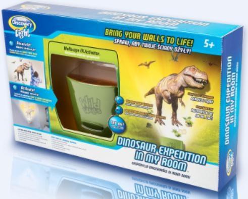 Naklej naklejkę, przymocuj projektor i zobacz realistycznie wyglądającego dinozaura we własnym pokoju!