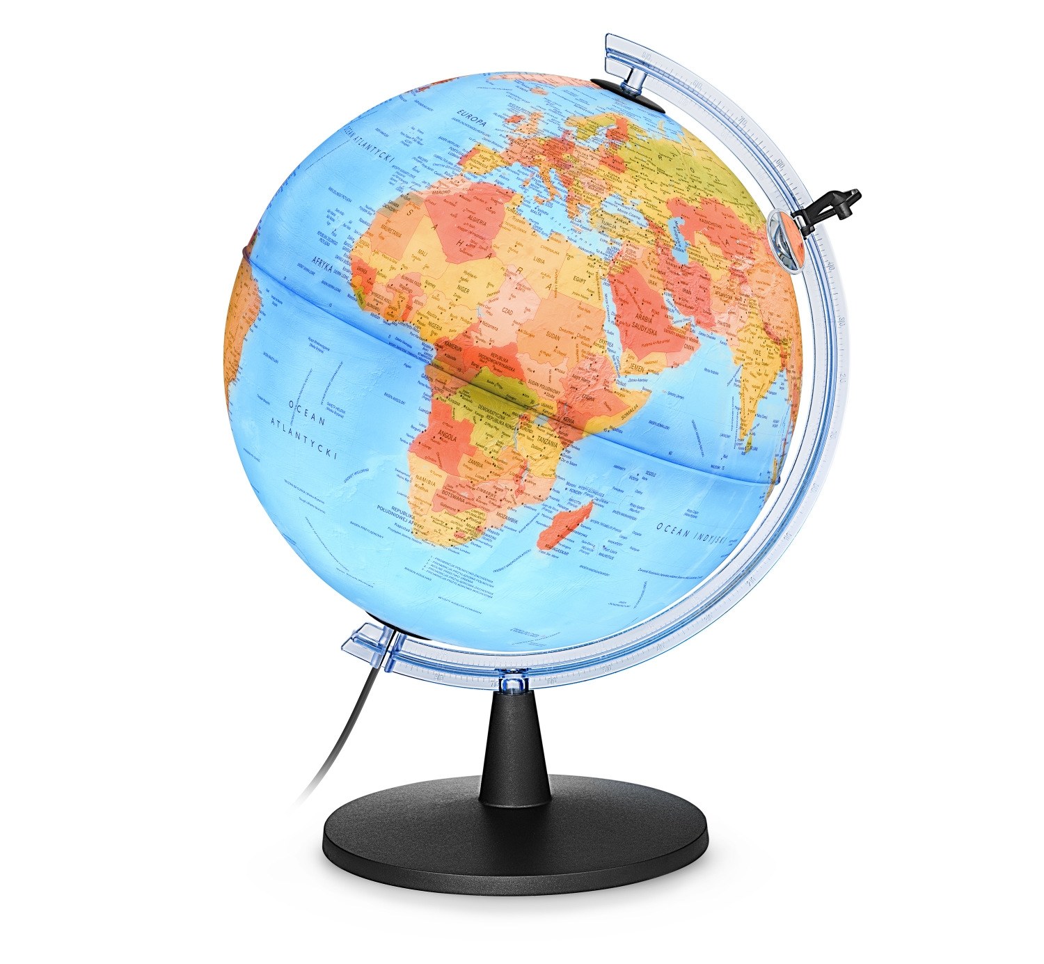 Montowany na solidnej plastikowej podstawie i osadzony na plastikowym meridianie. Mapa w języku polskim. Wielkość kuli 40 cm, wysokość 58 cm. Łatwa wymiana żarówki.
