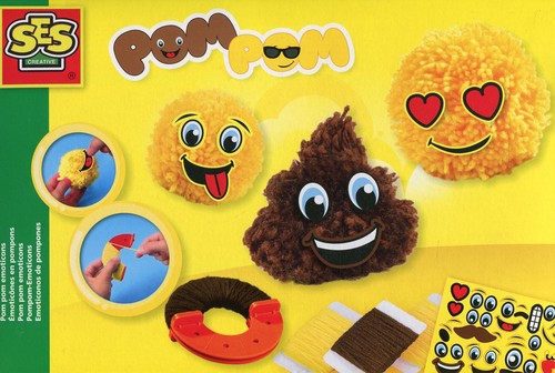 Stwórz 3 radosne emotki w kształcie pompona za pomocą kolorowej wełny i narzędzia do pomponów.