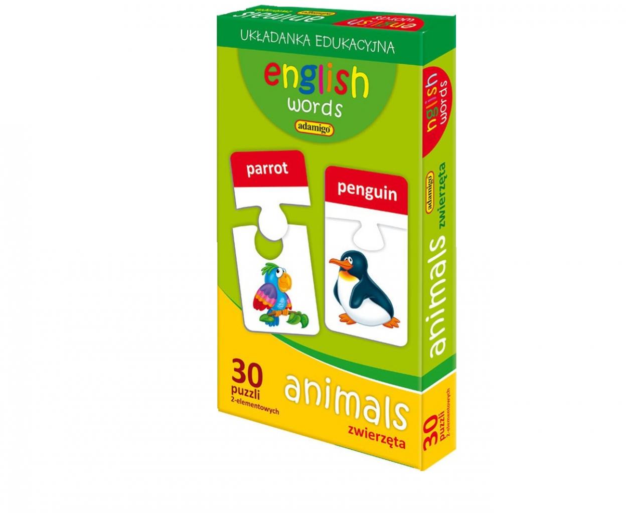 Zestaw dwuelementowych puzzli, składający się aż z 60 elementów. Podczas układania dzieci w naturalny sposób zapoznają się z zapisem angielskich słówek.