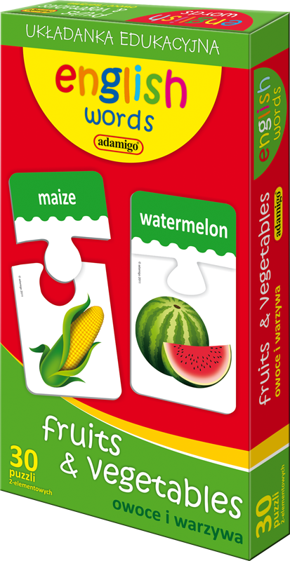 Zestaw dwuelementowych puzzli, składający się aż z 60 elementów. Podczas układania dzieci w naturalny sposób zapoznają się z zapisem angielskich słówek.