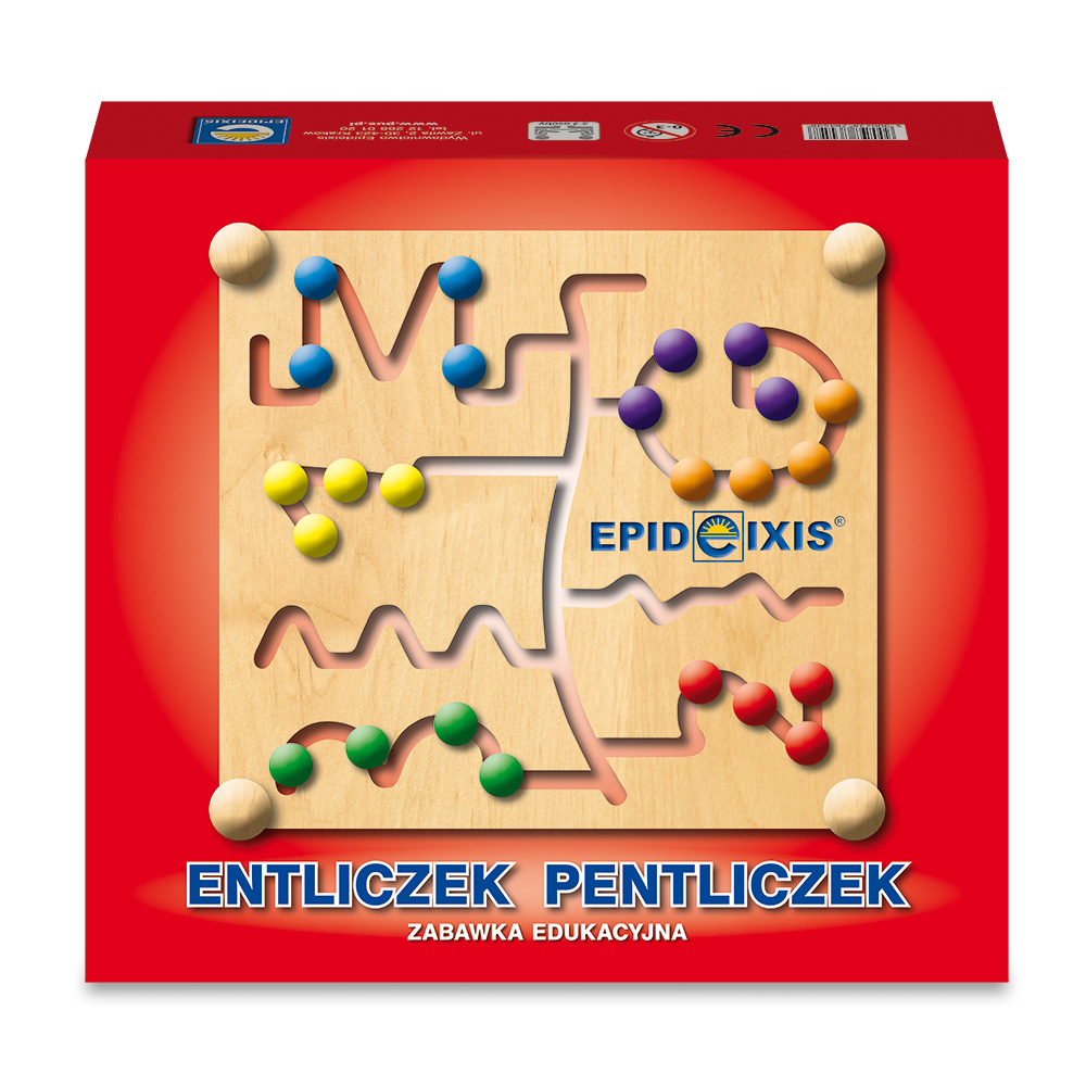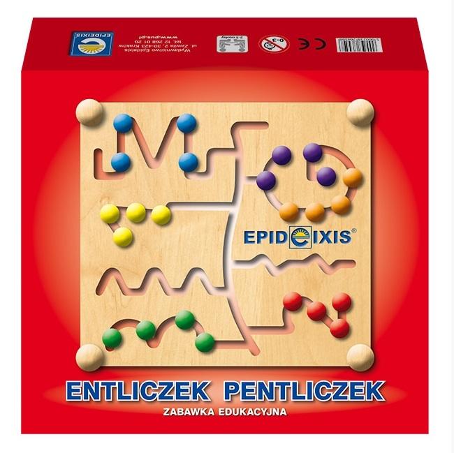 W jego wycięciach o kształtach literopodobnych umieszczone są 24 pary połączonych ze sobą drewnianych kulek w sześciu kolorach: czerwonym, zielonym, niebieskim, fioletowym, żółtym i pomarańczowym. Pary kolorowych kulek można przesuwać ścieżkami labiryntu po jego obydwu stronach, dlatego drewnianą podstawę Entliczka Pentliczka można ustawić pionowo lub poziomo.