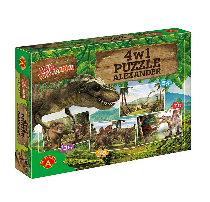 Puzzle Alexander"" rozwijają zdolności manualne, pobudzają ciekawość, spostrzegawczość oraz zdolność kojarzenia Układanie puzzli to dla dzieci dobry trening zręczności, myślenia, percepcji i właściwego kojarzenia koloru i kształtu. W pudelku 4 różne zestawy puzzli.Z 35, 48, 54 lub 70 elementów układanki można ułożyć 4 obrazki o wymiarach 33 x 22 cm.