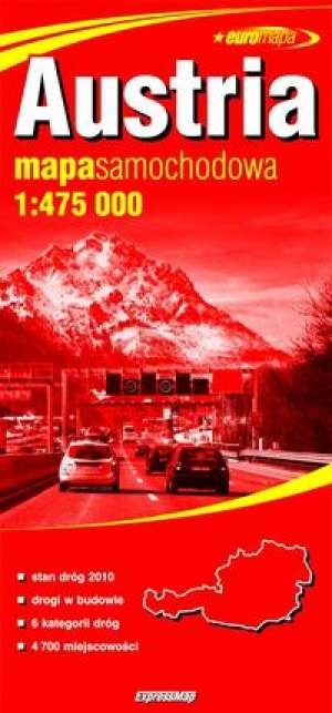 Austria - mapa samochodowa 1:475 000. Stan dróg 2010, odcinki w budowie, szczegółowa kategoryzacja i numeracja dróg, odległości drogowe w kilometrach, ośrodki narciarskie wraz z największymi wyciągami, opisy głównych pasm górskich oraz najważniejszych szczytów i przełęczy, plastyczna rzeźba terenu, lasy, parki narodowe, skorowidz miejscowości.