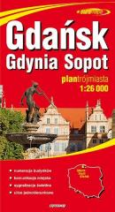 Gdańsk, Gdynia i Sopot w pełnych granicach administracyjnych, szczegółowy rysunek zabudowy wraz z numeracją budynków wzdłuż ulic i na osiedlach, linie autobusowe, trolejbusowe i tramwajowe wraz z przystankami, sygnalizacja świetlna, ulice jednokierunkowe, parkingi, bogata treść turystyczna, m.in.: zabytki, muzea, szlaki turystyczne, hotele i inne istotne obiekty, budynki użyteczności publicznej, centra handlowe, szczegółowe plany centrum Gdańska, Gdyni i Sopotu w skali 1:13 000 (1 cm - 130 m), mapa samochodowa okolic Trójmiasta, skorowidz ulic, informator teleadresowy, przebieg budowanej południowej obwodnicy Gdańska oraz innych arterii komunikacyjnych planowanych do budowy przed EURO 2012.