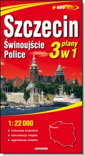 Mapa swoim zasięgiem obejmuje miasta w pełnych granicach administracyjnych. Zaletą planu jest szczegółowy rysunek zabudowy z dokładną numeracją budynków wzdłuż ulic oraz na osiedlach. Plan zawiera treść przydatną zarówno dla użytkownika zmotoryzowanego jak i korzystającego z komunikacji miejskiej - m. in. szczegółową sieć ulic, ulice jednokierunkowe, sygnalizację świetlną, parkingi, stacje benzynowe, numerację dróg krajowych i wojewódzkich, linie tramwajowe i autobusowe z nazwami przystanków, budynki użyteczności publicznej, centra handlowe, zabytki, szlaki turystyczne. Na odwrocie znajduje się plan centrum miasta w skali 1:10 000, schemat nocnych linii autobusowych, skorowidz ulic Szczecina, Świnoujścia i Polic oraz informator adresowy.