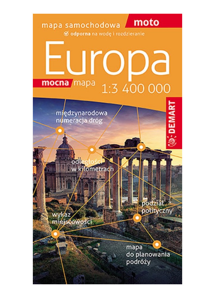 Europa - plastik mapa - skala 1:3 400 000. Bardzo atrakcyjna cena, wytrzymałość oraz szczegółowość to główne cechy charakteryzujące nową serię map foliowanych. Dzięki zastosowaniu nowatorskiej technologii mapa jest foliowana w całości, w dużym formacie. Zawiera: - indeks miejscowości - odległości w kilometrach - międzynarodową numerację dróg - podział polityczny