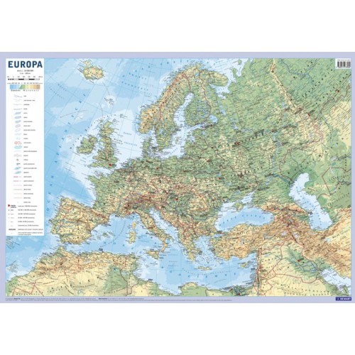Europa - mapa ścienna w skali 1: 10 000 000 - fizyczno-polityczna. Szczegółowo przedstawione ukształtowanie powierzchni oraz opis krain geograficznych umożliwia charakterystykę środowiska poszczególnych państw. Wyraźnie widoczne granice państw, bogata sieć komunikacyjna oraz duża liczba miejscowości do ważne atuty mapy