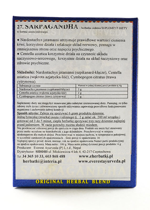 Wartości odżywcze Everest Ayurveda Herbatka SARPAGANDHA 100g - Nadciśnienie tętnicze