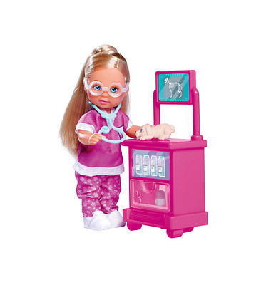 Lalka Evi jako weterynarz w okularach. W zestawie 3 szczeniaki, stół do badań, niezbędne akcesoria. Wysokość lalki 12 cm.