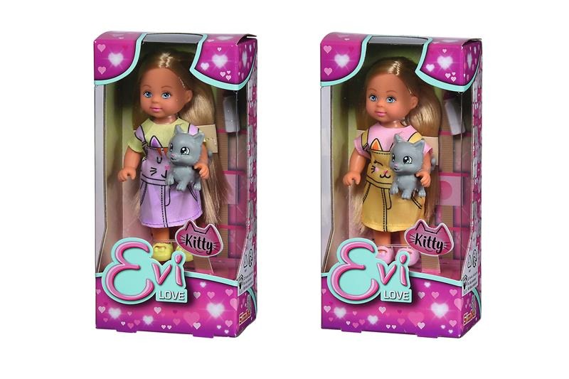 Evi w sukience, z figurką kotka i butelką do karmienia. Wysokość: 12 cm