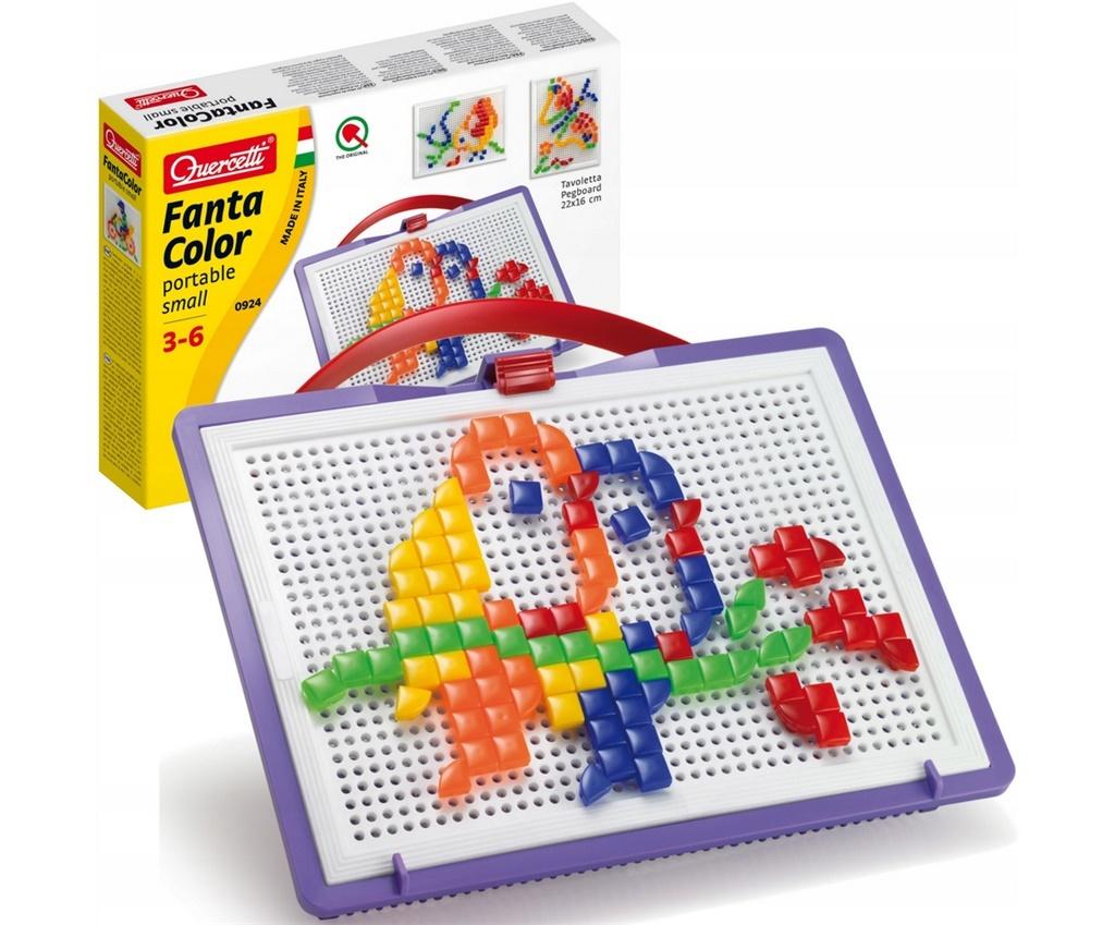Dzieci mogą tworzyć swoje pierwsze mozaiki lub kopiować przykłady z albumu. Zabawa polega na wstawianiu różnej wielkości, niełamliwych kołeczków w perforowaną tablicę. Gotową mozaikę można powiesić na ścianie, tak aby udekorować pokój w oryginalny sposób. Wszystkie elementy przechowywane są w poręcznej walizeczce, którą można swobodnie przenosić. Zabawka rozwija kreatywność oraz ćwiczy koordynację wzrokowo-ruchową. Zawartość: 100 kwadratowych i trójkątnych kołeczków walizka, album z przykładami do odwzorowania. Wiek 3-6 lat.
