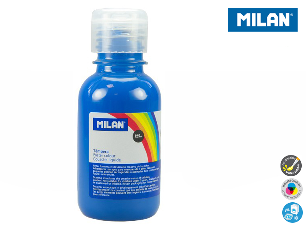 Farba tempera 125 ml w kolorze cyjan (jasny niebieski). Farby tempery zawierają bardzo dużo pigmentu. Są gęste przez co bardzo dobrze kryją malowaną powierzchnię. Żywe, intensywne kolory zachęcają dzieci do pracy. Idealne do bezpośredniej aplikacji lub po rozcieńczeniu wodą. Łatwo się spierają niemal z każdej powierzchni. Przezroczysta butelka ze specjalnym aplikatorem. Farby MILAN są zgodne z europejskimi i amerykańskimi normami bezpieczeństwa. Nie zawierają ftalanów, metali ciężkich i innych substancji toksycznych. Są bezpieczne dla dzieci.
