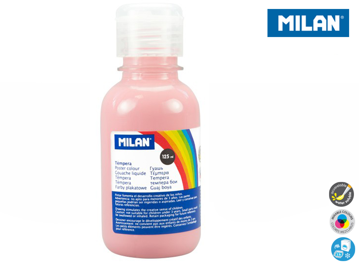 Farba tempera 125 ml w kolorze jasnego różu. Farby tempery zawierają bardzo dużo pigmentu. Są gęste przez co bardzo dobrze kryją malowaną powierzchnię. Żywe, intensywne kolory zachęcają dzieci do pracy. Idealne do bezpośredniej aplikacji lub po rozcieńczeniu wodą. Łatwo się spierają niemal z każdej powierzchni. Przezroczysta butelka ze specjalnym aplikatorem. Farby MILAN są zgodne z europejskimi i amerykańskimi normami bezpieczeństwa. Nie zawierają ftalanów, metali ciężkich i innych substancji toksycznych. Są bezpieczne dla dzieci.
