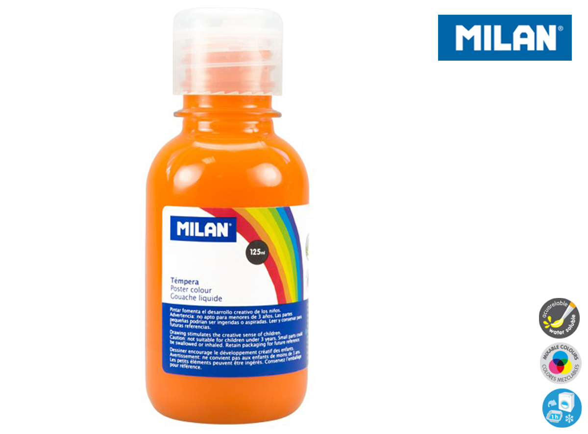 Farba tempera 125 ml w kolorze pomarańczowym. Farby tempery zawierają bardzo dużo pigmentu. Są gęste przez co bardzo dobrze kryją malowaną powierzchnię. Żywe, intensywne kolory zachęcają dzieci do pracy. Idealne do bezpośredniej aplikacji lub po rozcieńczeniu wodą. Łatwo się spierają niemal z każdej powierzchni. Przezroczysta butelka ze specjalnym aplikatorem. Farby MILAN są zgodne z europejskimi i amerykańskimi normami bezpieczeństwa. Nie zawierają ftalanów, metali ciężkich i innych substancji toksycznych. Są bezpieczne dla dzieci.