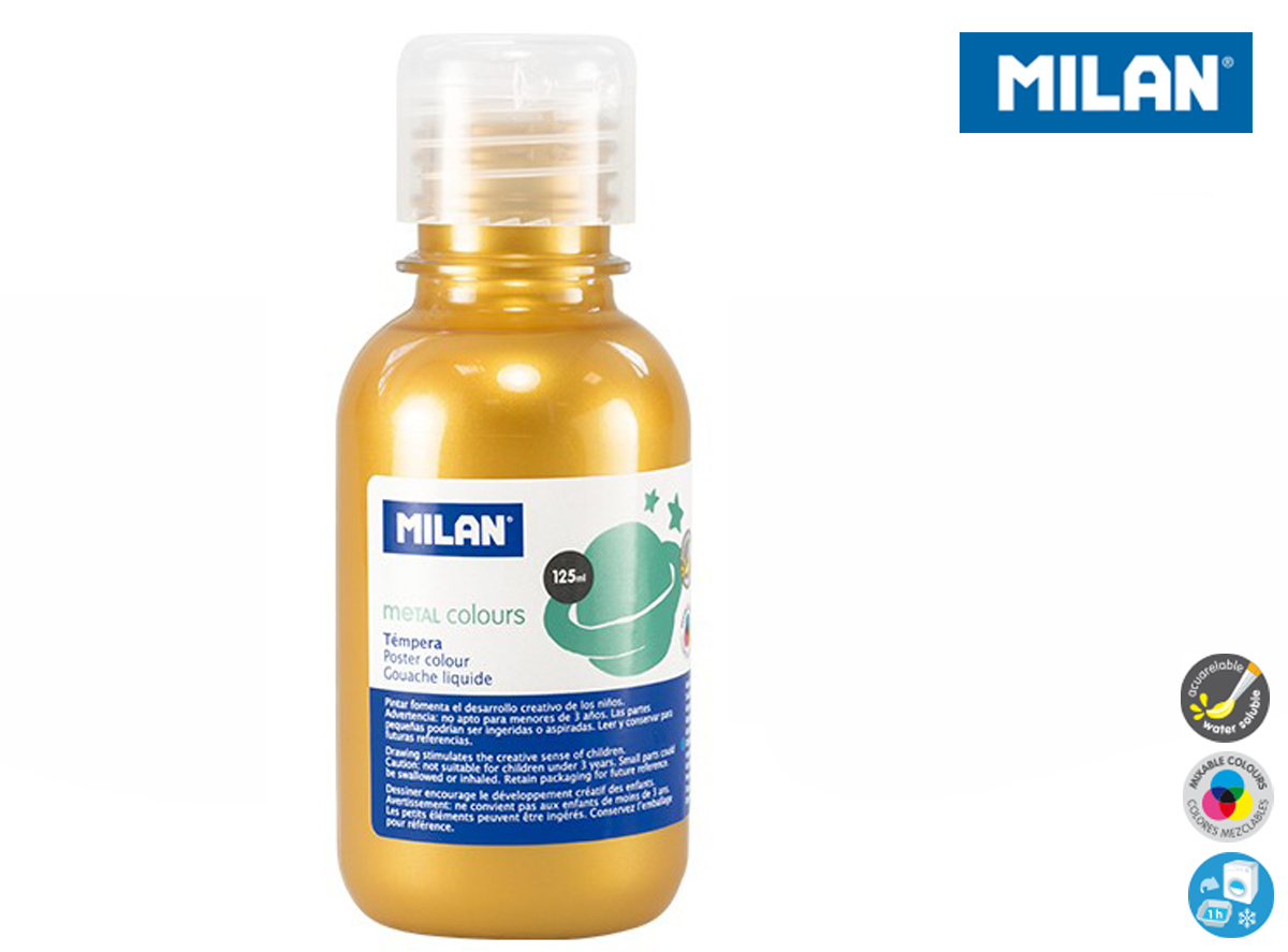 Farba tempera 125 ml w kolorze złotym. Farby tempery zawierają bardzo dużo pigmentu. Są gęste przez co bardzo dobrze kryją malowaną powierzchnię. Żywe, intensywne kolory zachęcają dzieci do pracy. Idealne do bezpośredniej aplikacji lub po rozcieńczeniu wodą. Łatwo się spierają niemal z każdej powierzchni. Przezroczysta butelka ze specjalnym aplikatorem. Farby MILAN są zgodne z europejskimi i amerykańskimi normami bezpieczeństwa. Nie zawierają ftalanów, metali ciężkich i innych substancji toksycznych. Są bezpieczne dla dzieci.