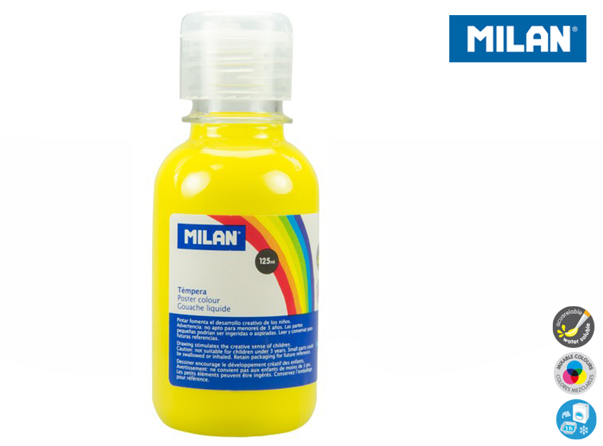 Farba tempera 125 ml w kolorze żółtym. Farby tempery zawierają bardzo dużo pigmentu. Są gęste przez co bardzo dobrze kryją malowaną powierzchnię. Żywe, intensywne kolory zachęcają dzieci do pracy. Idealne do bezpośredniej aplikacji lub po rozcieńczeniu wodą. Łatwo się spierają niemal z każdej powierzchni. Przezroczysta butelka ze specjalnym aplikatorem. Farby MILAN są zgodne z europejskimi i amerykańskimi normami bezpieczeństwa. Nie zawierają ftalanów, metali ciężkich i innych substancji toksycznych. Są bezpieczne dla dzieci.