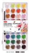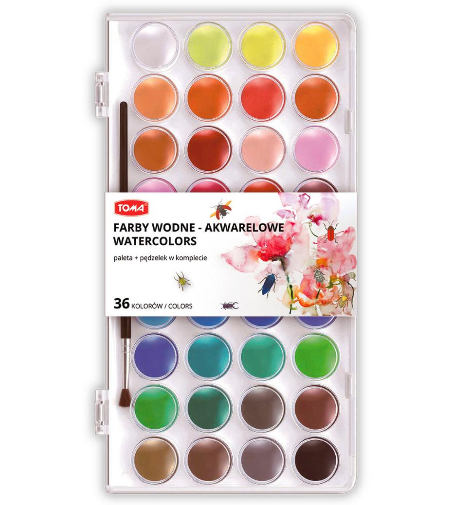 Zestaw farb akwarelowych w 36 żywych kolorach. Zestaw zawiera 36 farbek o średnicy 30 mm, pędzelek i odczepiane wieczko, które może być używane jako paleta. Farbki przeznaczone są dla dzieci od 3 lat. Zgodne z normą EN 71.