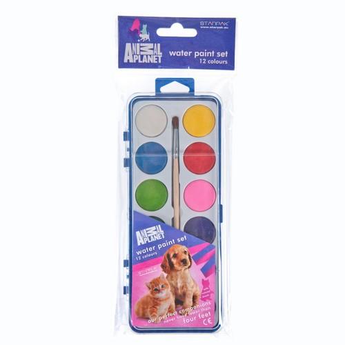 Zestaw wysokiej jakości farb akwarelowych w 12 kolorach z kolekcji Starpak z licencją Animal Planet Cute. Farby akwarelowe są tzw. farbami suchymi - nie wylewają się i łatwo je zmyć, dlatego są idealne dla najmłodszych artystów. W zestawie znajduje się także drewniany pędzelek. Całość zamknięto w plastikowym pudełku z zawieszką, ułatwiając przechowywanie.