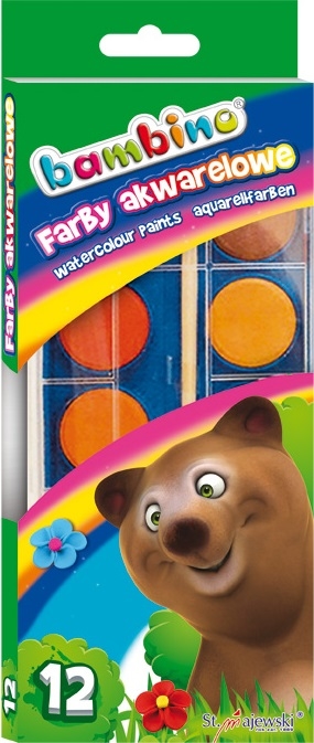 Farby akwarelowe to farby wodne podane w postaci suchych pastylek, które po zwilżeniu są gotowe do użycia. Farby te dedykowane są dzieciom i młodzieży, które chcą tworzyć bardziej zaawansowane plastycznie prace, głównie pejzaże czy portrety. Akwarele Bambino pozwalają uzyskiwać efekty świetlistości, delikatności, rozmycia konturów, grę światła. Można ich używać w technikach łączonych z farbami plakatowymi, temperą czy różnego rodzaju kredkami. Farby akwarelowe Bambino wyróżnia bogata paleta intensywnych kolorów, jakość i bezpieczeństwo użytkowania. Produkowane są bowiem w zgodności z dyrektywą Parlamentu Europejskiego i Rady w sprawie bezpieczeństwa zabawek oraz rozporządzeniem Ministerstwa Gospodarki w sprawie zasadniczych wymagań dla zabawek. Licencja - BAMBINO Ilość kolorów - 12 Cechy szczególne - Duże pastylki.