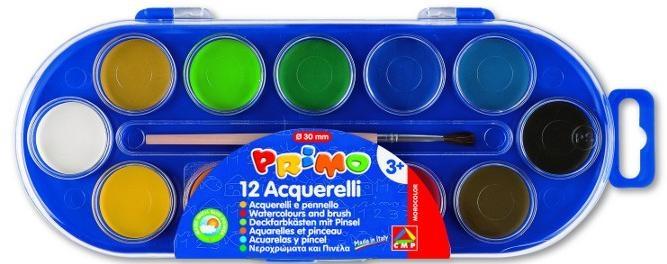 Plastikowa paletka z zawieszką zawiera 12 kolorów farb w pastylkach o średnicy 30mm oraz pędzelek.