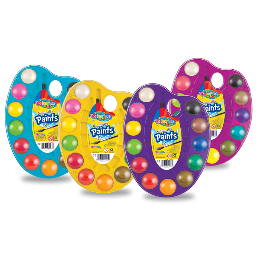 Farby akwarelowe Colorino Kids 12 kolorów na plastikowej paletce. W zestawie pędzelek.