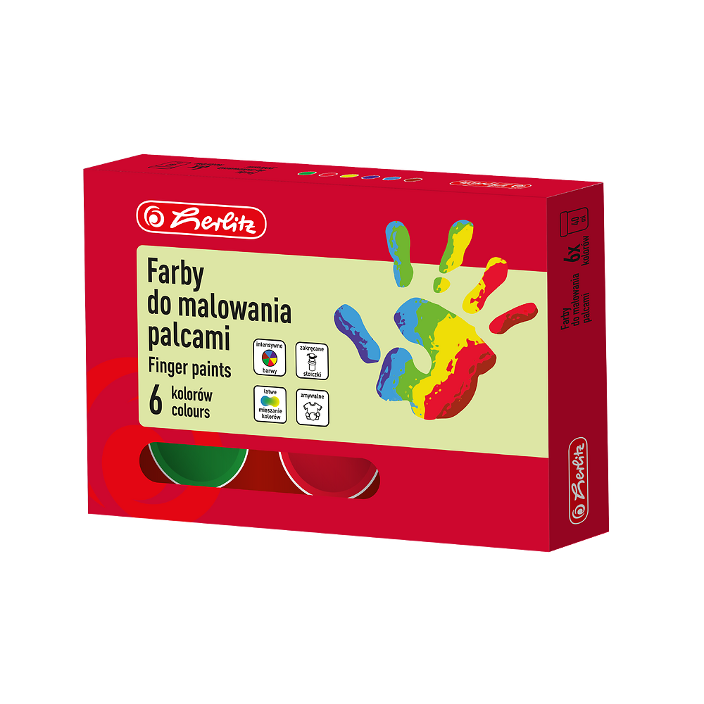 Farby do malowania palcami: intensywne, nasycone kolory w zakręcanych, wygodnych kubeczkach po 40 ml, nietoksyczne, zmywalne wodą, farbki idealnie kryją malowaną powierzchnię, nie tracą swojej intensywności w czasie, półpłynna konsystencja ułatwia nakładanie farby.