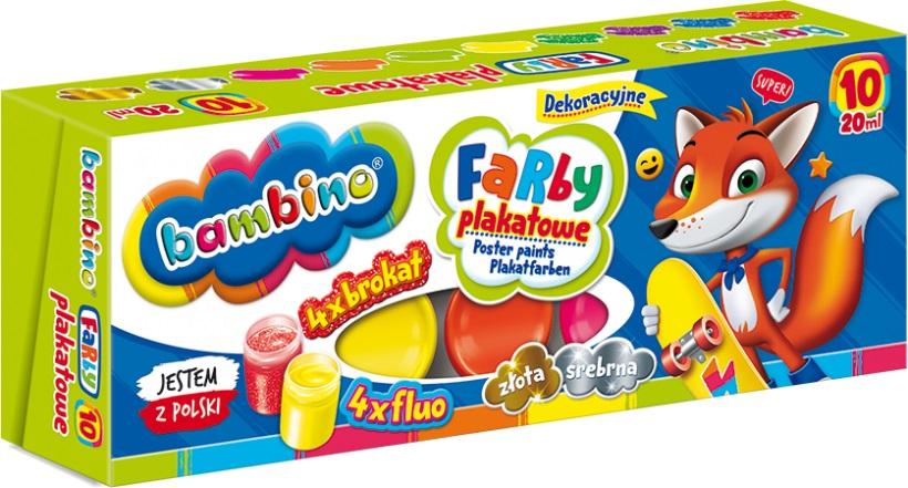 Farby plakatowe Bambino są farbami o czystych i nasyconych barwach. Mogą być stosowane bez użycia wody, nie skraplają się na podłożu. Po wyschnięciu wymalowanie jest matowe, barwy intensywne, odporne na działanie światła i ścieranie. Ze względu na znakomitą jakość idealnie rozprowadzają się na papierze, kartonie, drewnie, ceramice, kamieniu. Mogą być stosowane do malarstwa witrażowego. Farby plakatowe Bambino są bezpieczne dla dzieci, ponieważ produkowane są w zgodności z dyrektywą Parlamentu Europejskiego i Rady w sprawie bezpieczeństwa zabawek oraz rozporządzeniem Ministerstwa Gospodarki w sprawie zasadniczych wymagań dla zabawek. Licencja - BAMBINO Ilość kolorów - 10 Cechy szczególne - Farba w słoiczkach o pojemności 20 ml, wersja EXTRA to unikalny zestaw 4 farb fluorescencyjnych, 4 farb z brokatem, farby złotej i srebrnej