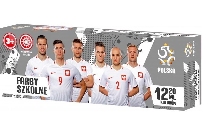 Farby 12 kolorów PZPN. Wygodne i szybkie w użyciu, nie wymagają rozcieńczania wodą. Odporne na działanie światła. Przeznaczone do malowania na papierze, kartonie, drewnie. Pojemność: 12x20ml.