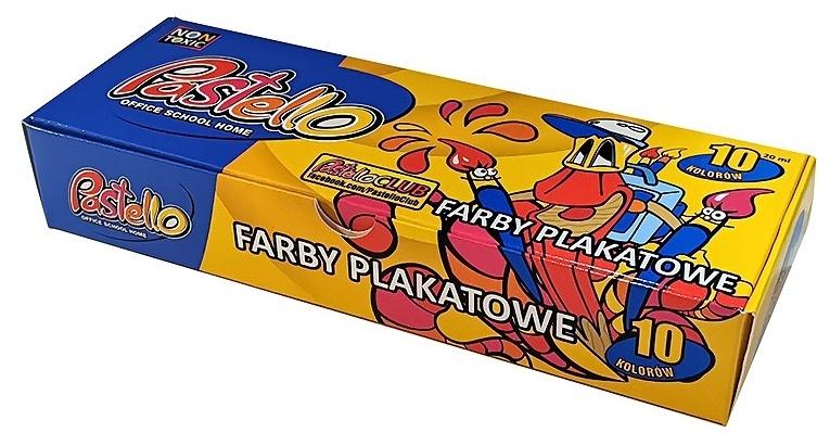 Farby plakatowe 10 kolorów. Pojemność 20 ml. Farby na bazie wody o intensywnych kolorach. Znakomitą przyczepność pozwala na malowanie takich podłoży jak: papier, karton, drewno, ceramika, kamień. Wymalowane powierzchnie po wyschnięciu są matowe o intensywnych barwach, odporne na działanie światła i ścieranie. Wyprodukowane w Polsce.
