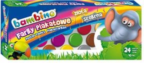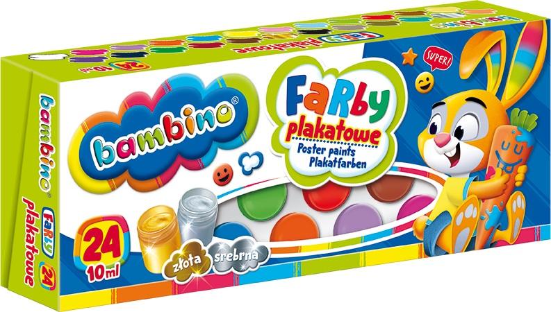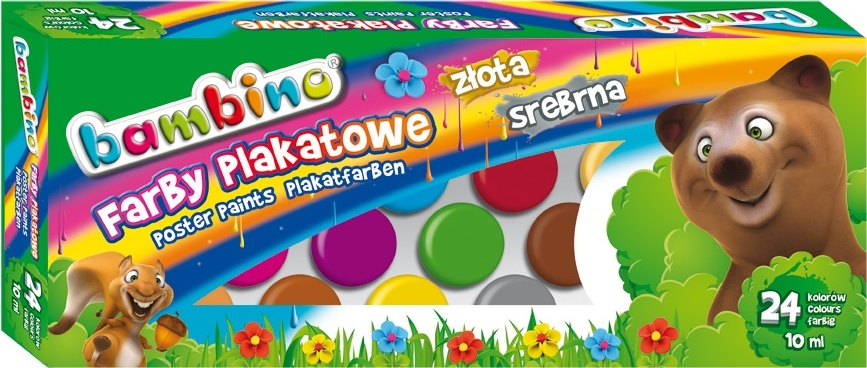 Farby plakatowe Bambino są farbami o czystych i nasyconych barwach. Mogą być stosowane bez użycia wody, nie skraplają się na podłożu. Po wyschnięciu wymalowanie jest matowe, barwy intensywne, odporne na działanie światła i ścieranie. Ze względu na znakomitą jakość idealnie rozprowadzają się na papierze, kartonie, drewnie, ceramice, kamieniu. Mogą być stosowane do malarstwa witrażowego. Farby plakatowe Bambino są bezpieczne dla dzieci, ponieważ produkowane są w zgodności z dyrektywą Parlamentu Europejskiego i Rady w sprawie bezpieczeństwa zabawek oraz rozporządzeniem Ministerstwa Gospodarki w sprawie zasadniczych wymagań dla zabawek. Licencja - BAMBINO Ilość kolorów - 24 Cechy szczególne - Farba w słoiczkach o pojemności 10 ml
