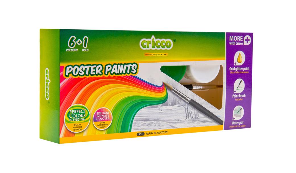 Wysokiej jakości farby plakatowe. Idealne mieszanie kolorów, barwy żywe i intensywne. Dzięki gęstej konsystencji posiadają doskonałe właściwości kryjące. W każdym zestawie złota farba brokatowa oraz pędzelek. W wytłoczce opakowania specjalny pojemnik na wodę.