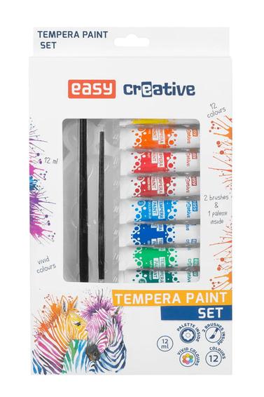 farby tempera (12 tubek), 2 pędzelki, tacka do mieszania kolorów.