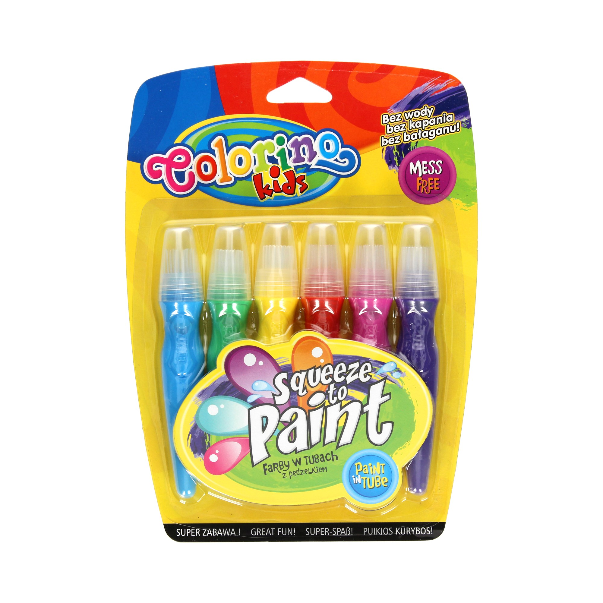 Farby w tubach z pędzelkami w 6 intensywnych kolorach. Wystarczy nacisnąć i już można malować. Nie potrzeba żadnych dodatkowych akcesoriów ani wody! Każda farbka zamknięta jest w wygodnej plastikowej tubie zakończonej pędzelkiem z tworzywa sztucznego. Farbki są gęste, dzięki czemu doskonale nadają się do malowania dużych powierzchni. Idealne dla małych artystów. Bez wody, bez kapania, bez bałaganu!