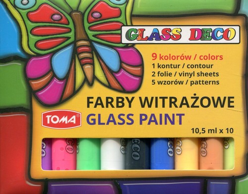 Wodne farby witrażowe, przeznaczone do tworzenia motywów na okna, lustra, szklanki, wazony oraz np. na lodówki i inne lakierowane powierzchnie. Po wyschnięciu farbki dają piękny efekt przezroczystości, który można podkreślić podświetlając motyw. Wybrany motyw maluje się na specjalnej folii. Po wyschnięciu i ściągnięciu z folii obrazek sam przylega do gładkich i czystych powierzchni. Tubka zawiera 10,5 ml farby.