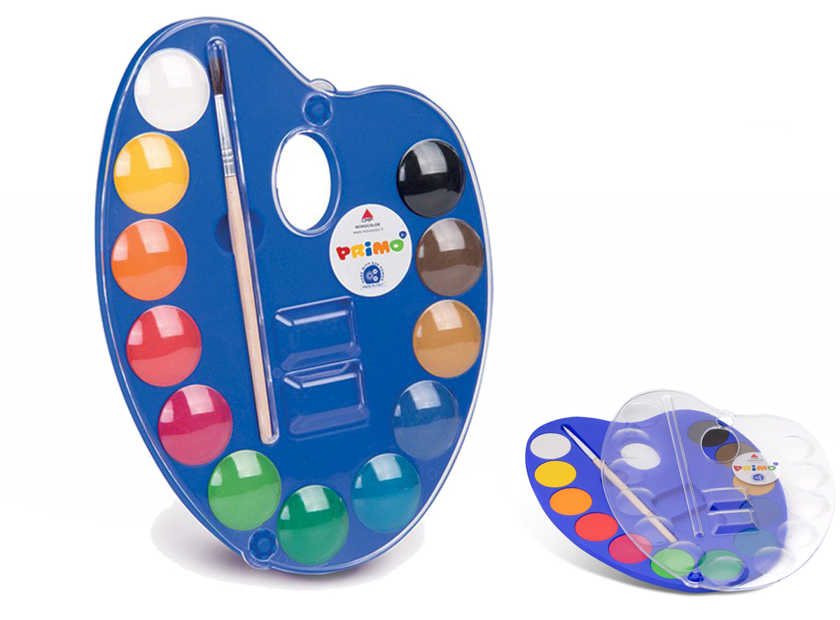 Plastikowa owalna paletka zawiera 12 kolorów farb w pastylkach o średnicy 25mm oraz pędzelek. Zdejmowane zamknięcie służy jednocześnie jako paletka do mieszania kolorów.