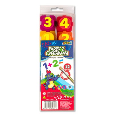 Farby mogą być stosowane bez użycia wody, idealnie rozporwadzają się na papierze, kartonie czy brystolu. 12 super kolorów do wyboru, w dużych 20 ml słoiczkach. Każdy pojemniczek posiada wieczko z innym stempelkiem. Dodatkowo w opakowaniu znajduje się wysokiej jakości drewniany pędzelek. Słoiczki składają się w kolorowe puzzle. Zestaw z cyferkami umożliwia naukę działań matematycznych przez zabawę. Nietoksyczne, zgodne z EN7 1-3.