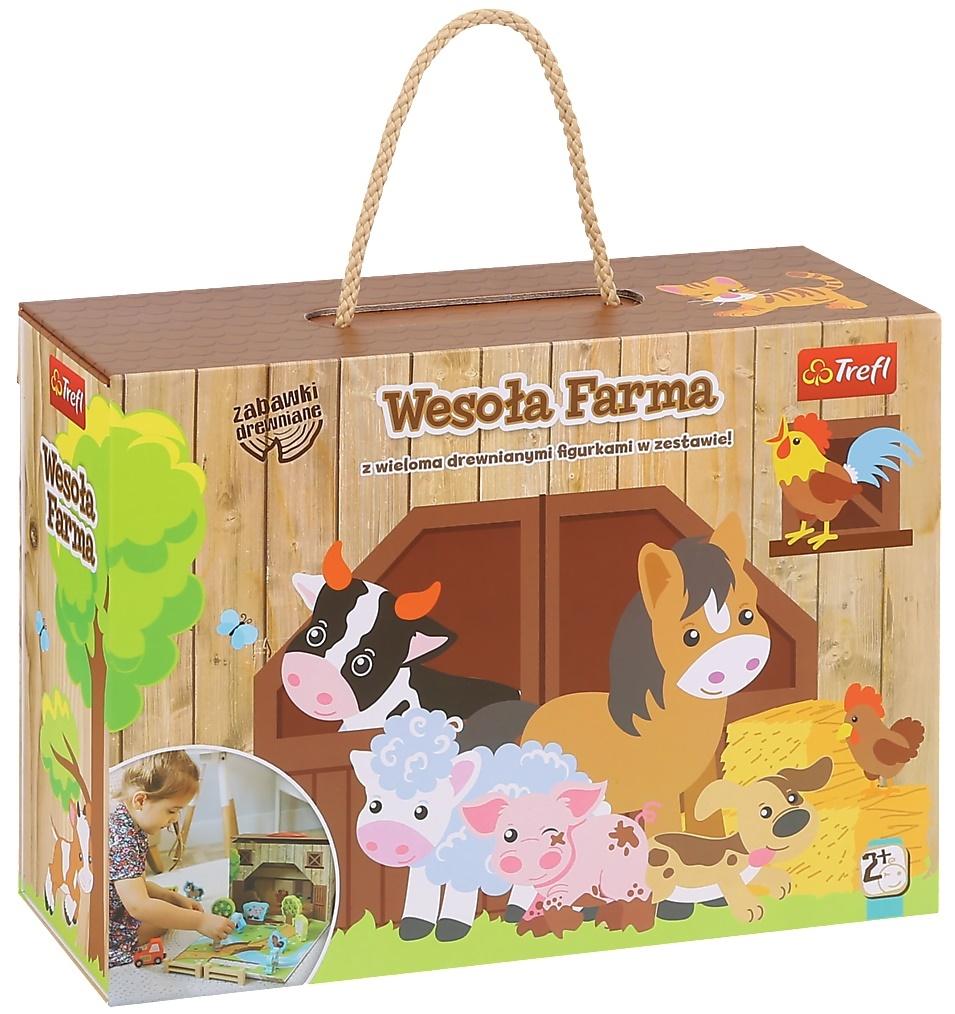 Wesoła farma to zestaw drewnianych figurek wraz z tekturową scenerią farmy z elementami magnetycznymi, która stanowi zarówno opakowanie, jak i element zabawki.