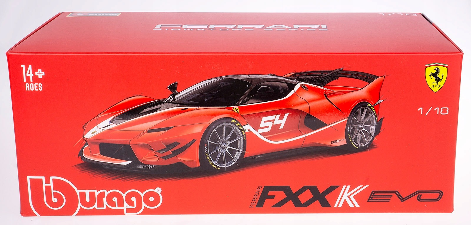 Model Bburago Ferrari FXX-K Evo #54 (18-16908) z kolekcji sygnowanej znakiem jakości Ferrari (stosowny hologram potwierdzający autentyczność na opakowaniu) w skali 1:18. Każdy model Ferrari jest wiernym odwzorowaniem jego prawdziwego odpowiednika, dzięki wielkiej dbałości o szczegóły oraz zastosowaniu wysokiej jakości materiałów.