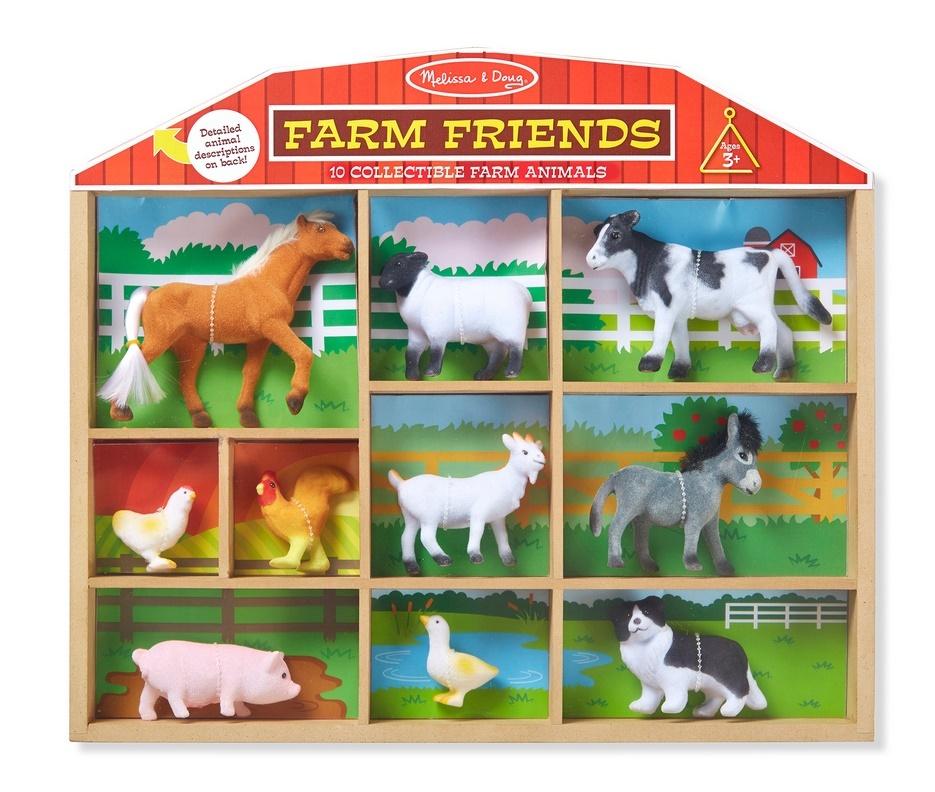 Zestaw 10 figurek przedstawiających różne zwierzęta gospodarskie. Figurki pokryte są mięciutkim w dotyku materiałem. Zwierzaki dodatkowo zapakowane są w drewnianą ramkę, w której można je potem eksponować i przechowywać. Zestaw zawiera: konika, kurę, świnkę, kaczkę, krowę, osiołka, gęś, koguta, owcę i pieska.