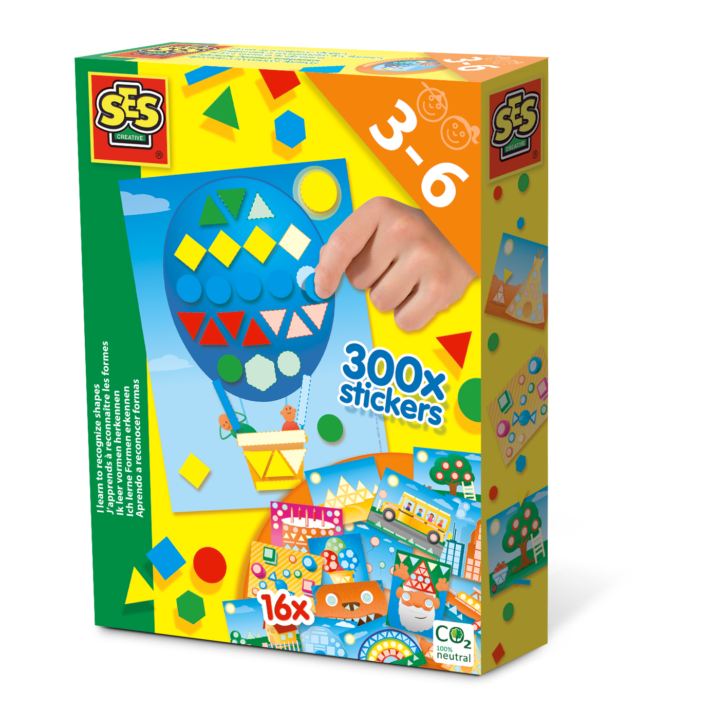 Zestaw do nauki poznawania kształtów, kolorów oraz ćwiczenia zdolności manualnych u dziecka. W zestawie znajduje się 16 kolorowych kart z nadrukowanymi miejscami do wklejenia odpowiednich figur, 7 plansz z naklejkami figur geometrycznych w kolorach: niebieskim, czerwonym, żółtym i zielonym łącznie 300 szt. Dla dzieci od 3 roku. Wyprodukowano w Holandii.