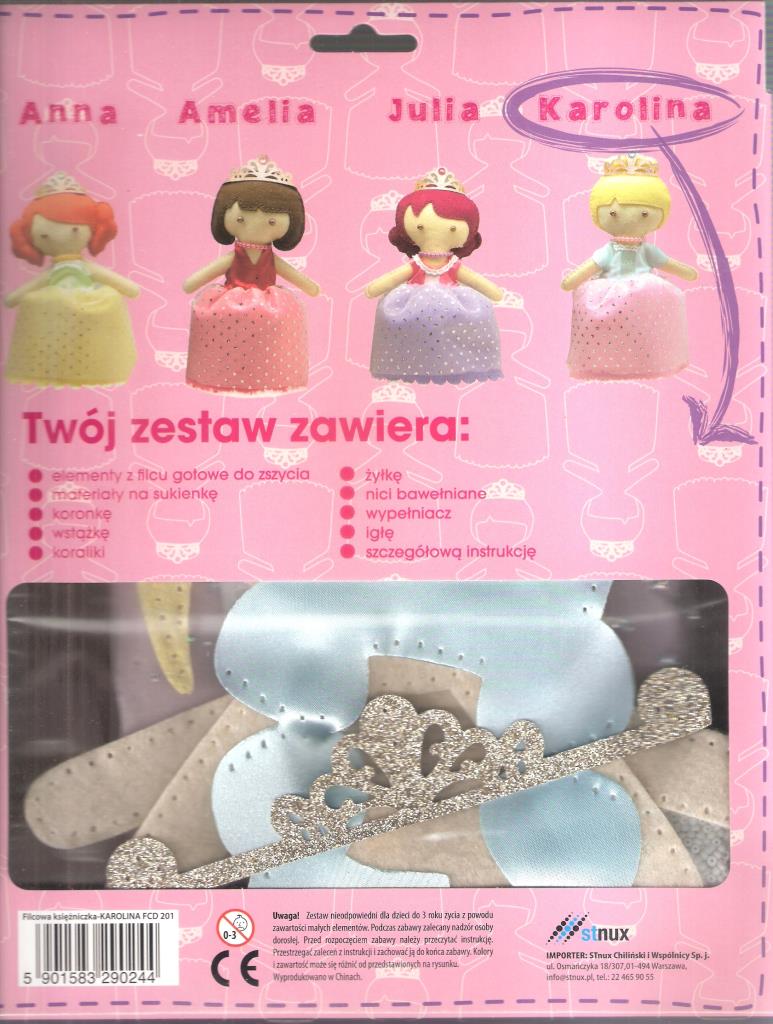 Wyczaruj własną księżniczkę! Zestaw zawiera: elementy z filcu gotowe do zszycia materiały na sukienkę koronkę wstążkę koraliki żyłkę nici bawełniane wypełniacz igłę szczegółową instrukcję.