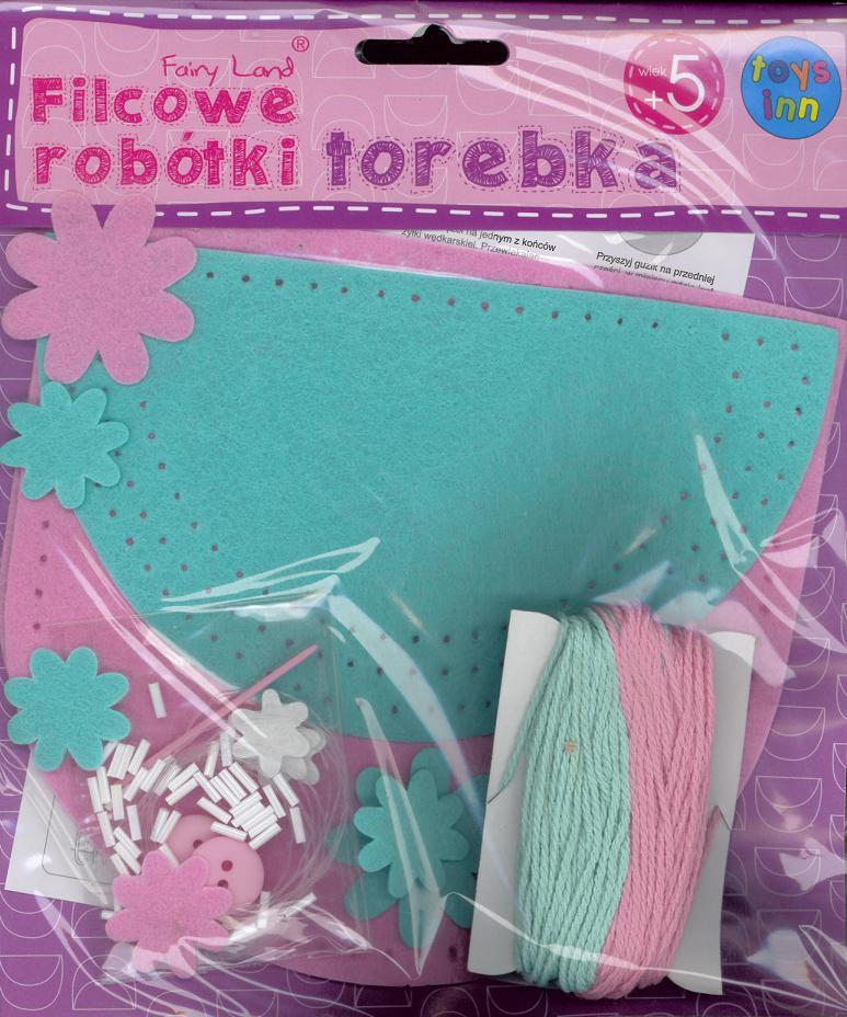 Uszyj własną torebkę!Zestaw zawiera: elementy z filcu gotowe do zszycia 2 guziki żyłkę wędkarską kolorowe nici bawełniane 40 szt koralików - rurek o długości 6 mm plastikową igłę szczegółową instrukcję.