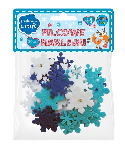 Zestaw zawiera 30 samoprzylepnych, filcowych naklejek w ksztacie śnieżynek. Naklejki mają różną wielkość i dostępne są w 3 kolorach: białym, niebieskim, granatowym.