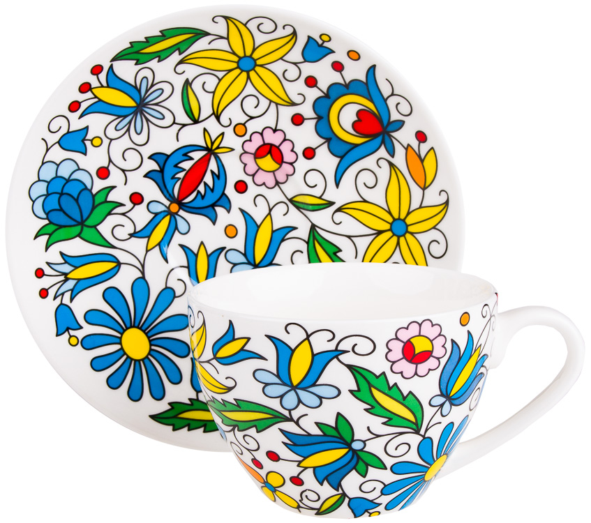 - wzór kaszubski znajduje się na całej powierzchni filiżanki i wierzchu spodka